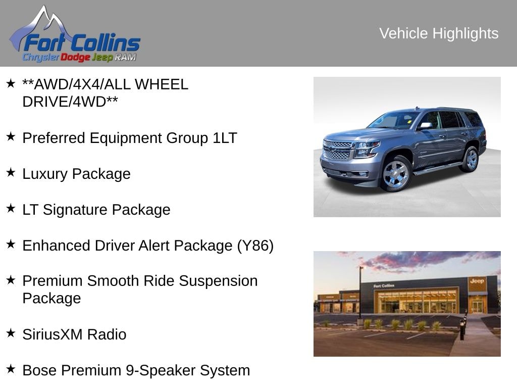 **AWD/4X4/ALL WHEEL DRIVE/4WD**, 1st & 2nd Row Color-Keyed Carpeted Floor Mats, 2nd Row 60/40 Split-Folding Manual Bench, 2nd Row Pwr Release 60/40 Split Folding Bench Seat, 3rd Row 60/40 Power Fold Split-Bench, 3rd Row Manual 60/40 Split-Folding Fold Flat Bench, 4-Wheel Antilock Disc Brakes w/Brake Assist, 5 12-Volt Auxiliary Power Outlets, Auto-Dimming Inside Rear-View Mirror, Black Assist Steps, Bose Premium 9-Speaker System, Bright Bodyside Moldings, Cargo Net, Chrome Assist Step Kit (LPO), Chrome Recovery Hooks, Color-Keyed Carpeting Floor Covering, Driver Inboard & Front Passenger Airbags, Electronic Cruise Control w/Set & Resume Speed, Enhanced Driver Alert Package (Y86), Extended-Range Remote Keyless Entry, Floor Console, Fog Lamps, Forward Collision Alert, Front & Rear Park Assist, Front Passenger 6-Way Power Seat Adjuster, Grille Insert (LPO), Hands Free Power Liftgate, Heated 2nd Row Seats, Heated Leather Wrapped Steering Wheel, IntelliBeam Headlamps, Lane Change Alert w/Side Blind Zone Alert, Lane Keep Assist w/Lane Departure Warning, Leather-Wrapped Steering Wheel, Low Speed Forward Automatic Braking, LT Signature Package, Luxury Package, Memory Settings, Passive Entry System, Polished Exhaust Tip, Power Liftgate, Power Tilt & Telescopic Steering Column w/Memory, Power-Adjustable Accelerator & Brake Pedals, Power-Folding Heated Outside Mirrors, Preferred Equipment Group 1LT, Premium Smooth Ride Suspension Package, Push Button Keyless Start, Rear Cross Traffic Alert, Rear Park Assist w/Audible Warning, Remote Vehicle Start, Roof-Mounted Luggage Rack Side Rails, SiriusXM Radio, Universal Home Remote, Wheels: 20" x 9" Chrome.