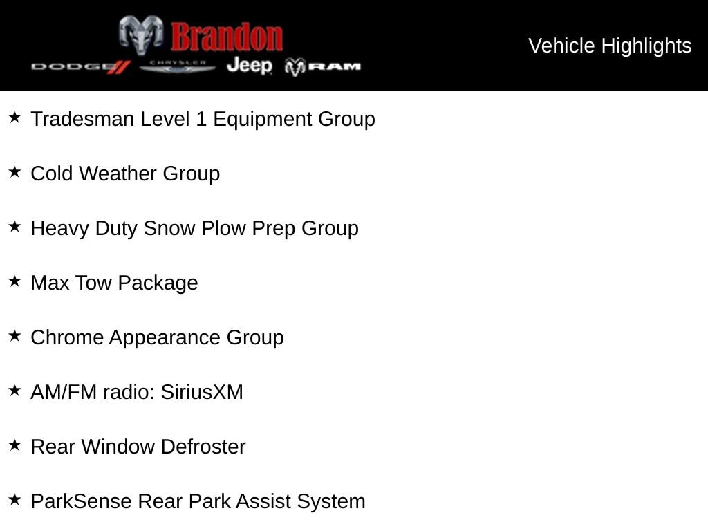 ⢠Tradesman Level 1 Equipment Group with rear window defroster, black power-heated fold-telescope mirrors, and ParkSense rear park assist system