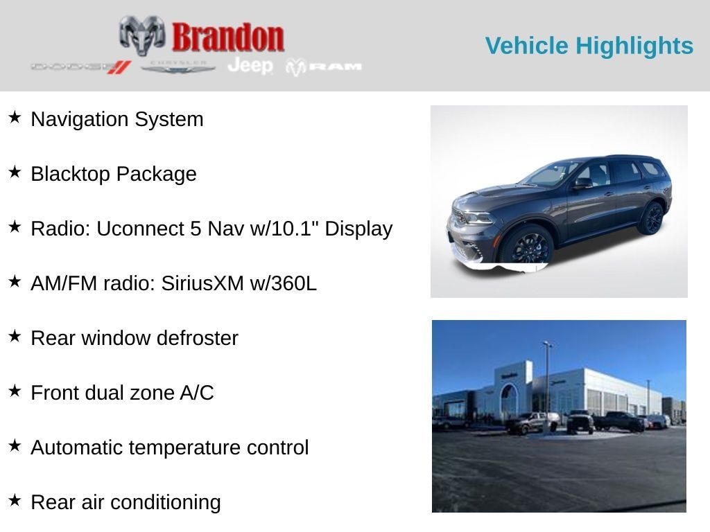 New Price! Vapor Gray 2025 Dodge Durango R/T Plus AWD 8-Speed Automatic HEMI 5.7L V8 Multi Displacement VVT AWD, 2nd Row Fold/Tumble Captain Chairs, 2nd Row Seat Mounted Inboard Armrests, 6-Passenger Seating, AM/FM radio: SiriusXM w/360L, Auto-leveling suspension, Automatic temperature control, Black Roof Rails, Blacktop Package, Class IV Receiver Hitch, Front dual zone A/C, Fully automatic headlights, Heated front seats, Heated steering wheel, Leather steering wheel, Navigation System, ParkView Rear Back-Up Camera, Power Liftgate, Power Sunroof, Radford Track Experience, Radio: Uconnect 5 Nav w/10.1" Display, Rear air conditioning, Rear Load Leveling Suspension, Rear window defroster, Security system, Steering wheel mounted audio controls, Ventilated Front Seats, Wheels: 20" x 8.0" Black Noise Aluminum.