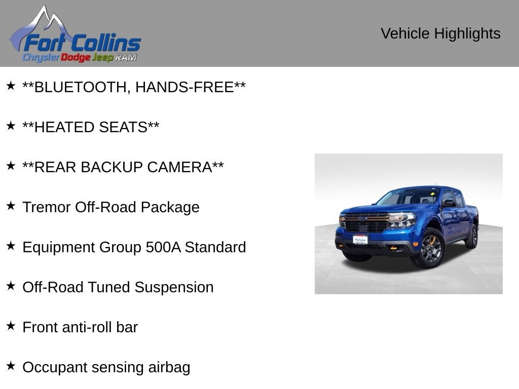 Explore the great outdoors in style and comfort, thanks to the Maverick Lariat's impressive list of premium features. The Tremor Off-Road Package adds a host of off-road-focused enhancements, including front tow hooks, an off-road screen in the cluster, and unique styling elements that set this Maverick apart from the crowd.