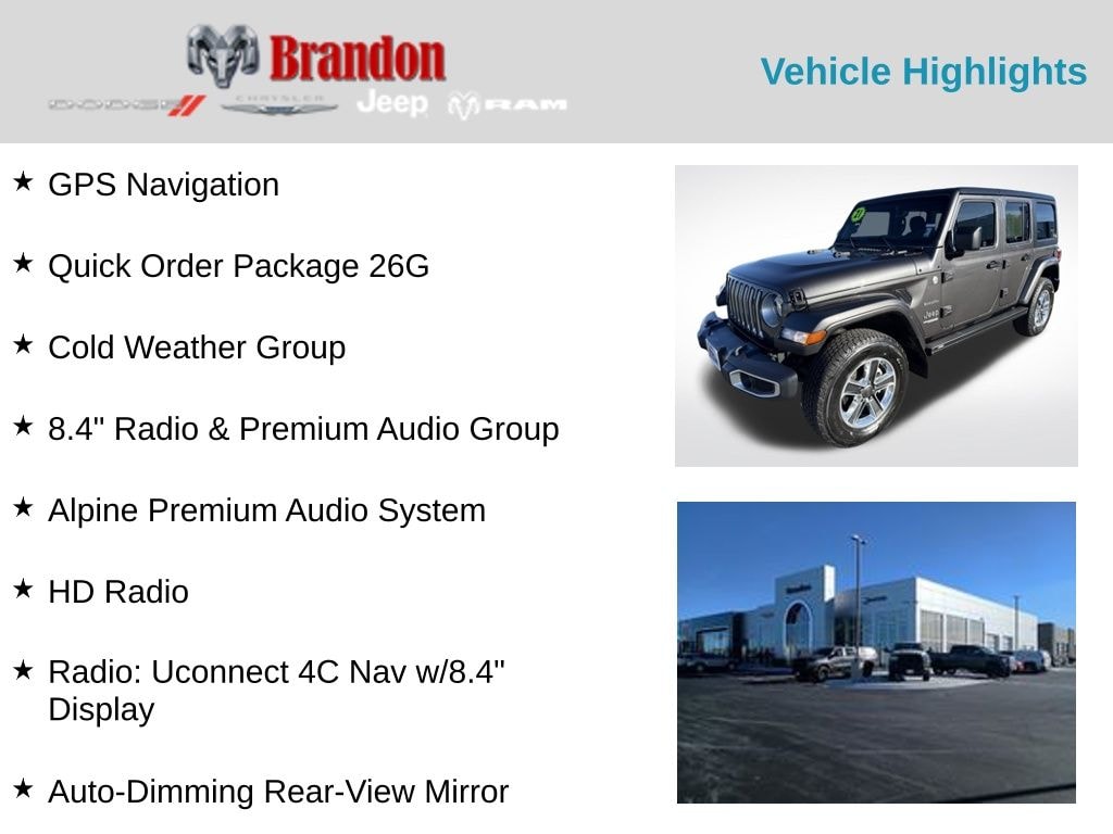 Granite Crystal Metallic Clearcoat 2021 Jeep Wrangler Unlimited Sahara 4WD 8-Speed Automatic 3.0L V6 Turbodiesel Wrangler Unlimited Sahara, 3.0L V6 Turbodiesel, 4WD, 1-Year SiriusXM Guardian Trial, 4G LTE Wi-Fi Hot Spot, 5-Year SiriusXM Traffic Service, 5-Year SiriusXM Travel Link Service, 8.4" Radio & Premium Audio Group, 8.4" Touchscreen Display, Alpine Premium Audio System, Auto-Dimming Rear-View Mirror, Cold Weather Group, Emergency/Assistance Call, For Details, Visit DriveUconnect.com, GPS Navigation, HD Radio, Heated Front Seats, Heated Steering Wheel, Quick Order Package 26G, Radio: Uconnect 4C Nav w/8.4" Display, SiriusXM Traffic Plus, SiriusXM Travel Link.
