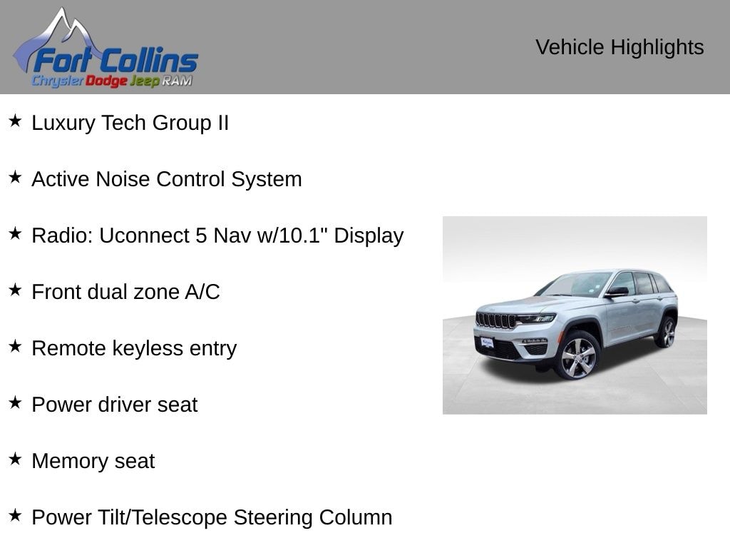 Silver Zynith 2025 Jeep Grand Cherokee Limited 4WD 8-Speed Automatic 3.6L V6 24V VVT 2nd-Row Manual Window Shades, Active Cruise Control, Active Noise Control System, Capri Leatherette w/Axis II Seats, Dual front impact airbags, Dual front side impact airbags, Dual-Pane Panoramic Sunroof, Four wheel independent suspension, Front dual zone A/C, Front/Rear Doors & Liftgate w/Passive Entry, Heated front seats, Heated rear seats, Heated steering wheel, Integrated Off-Road Camera, Intersection Collision Assist System, Knee airbag, Luxury Tech Group II, Memory seat, Memory Steering Column, Overhead airbag, ParkSense Front/Rear Park Assist w/Stop, ParkView Rear Back-Up Camera, Power driver seat, Power Liftgate, Power passenger seat, Power Tilt/Telescope Steering Column, Radio: Uconnect 5 Nav w/10.1" Display, Rear Back-Up Camera Washer, Remote keyless entry, Surround View Camera System, Ventilated Front Seats, Wheels: 20" x 8.5" Polished/Painted Aluminum, Wireless Charging Pad.