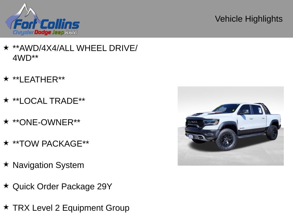**AWD/4X4/ALL WHEEL DRIVE/4WD**, **LEATHER**, **LOCAL TRADE**, **ONE-OWNER**, **TOW PACKAGE**, #2 Seat Foam Cushion, 2-Door Passive Entry, Front Door Locks, 4 Way Front Headrests, Adaptive Cruise Control w/Stop & Go, Advanced Safety Group, Bed Utility Group, Blind Spot & Cross Path Detection, Body Color Door Handles, Bucket Seats, Center Console Parts Module, Digital Rearview Mirror, Driver Seat Memory, Driver/Passenger Wrapped Assist Handles, Exterior Mirrors w/Memory, Front Door Accent Lighting, Front Seat Back Map Pockets, Full Length Premium Upgraded Floor Console, harman/kardon 19 Speaker Premium Sound, Heads-Up Display, Heated Front Seats, Heated Second Row Seats, Heated Steering Wheel, IP LED Ambient Light Pipe, Lane Keep Assist, Leather Trimmed Bucket Seats, Leather/Carbon Flat-Bottom Steering Wheel, Leather/Suede Flat-Bottom Steering Wheel, LED CHMSL Lamp, Luxury Front Door Trim Panel, MOPAR 4 Adjustable Cargo Tie-Down Hooks, MOPAR Bright Pedal Kit, MOPAR Deployable Bed Step, MOPAR Spray In Bedliner, Navigation System, ParkSense Front/Rear Park Assist w/Stop, Pedestrian Emergency Braking, Pick-Up Box Lighting, Power 4-Way Driver Lumbar Adjust, Power 4-Way Passenger Lumbar Adjust, Power 8-Way Driver & Passenger Seats, Power Adjustable Pedals w/Memory, Premium Wrapped IP Bezel, Quick Order Package 29Y, Radio/Driver Seat/Mirrors/Pedals Memory, Rain Sensitive Windshield Wipers, Real Carbon Fiber Interior Accents, Rear 60/40 Folding Seat, Rear 60/40 Folding Split Recline Seat, Rear Door Accent Lighting, Rear Underseat Compartment Storage, Rear Window Defroster, Remote Tailgate Release, Sun Visors w/Illuminated Vanity Mirrors, Surround View Camera System, Tailgate Ajar Warning Lamp, Trailer Brake Control, Trailer Light Check, Trailer Tire Pressure Monitoring System, Trailer Tow Group, TRX Carbon Fiber Package, TRX Level 2 Equipment Group, Universal Garage Door Opener, Ventilated Front Seats, Ventilated Rear Seats, Wireless Charging Pad.
