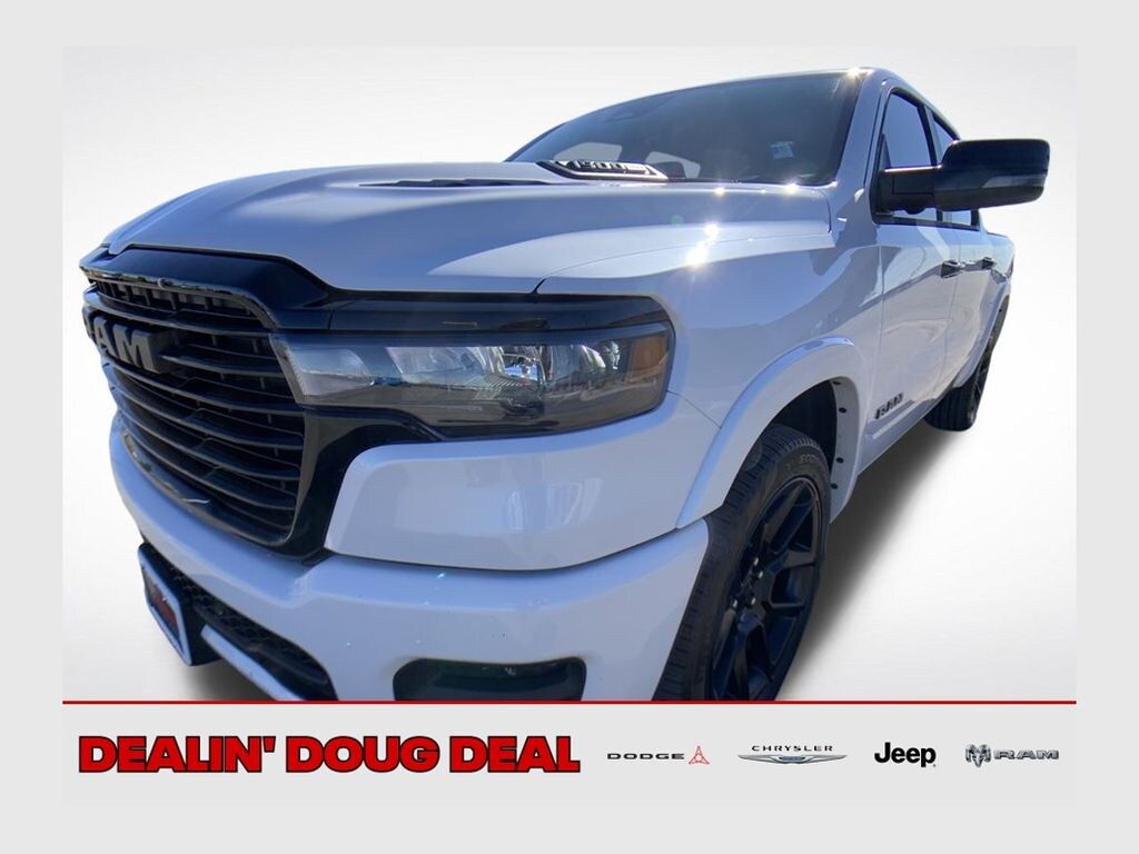Ivory White Tri-Coat Pearlcoat 2025 Ram 1500 Laramie 4WD 8-Speed Automatic 3.0L I6 1500 Laramie, 3.0L I6, 4WD, Black Leather, #1 Seat Foam Cushion, 14.4" Touchscreen Display, 3 Rear Seat Head Restraints, 4 Way Front Headrests, 4G LTE Wi-Fi Hot Spot, Accent Color Door Handles, Accent Color Premium Power Mirrors, Accent Color Tailgate Handle, Anti-Spin Differential Rear Axle, Apple CarPlay, Auto Power-Folding Mirrors, Auto-Dimming Exterior Driver Mirror, Bed Utility Group, Black Exterior Truck Badging, Black Headlamp Bezels, Black Interior Accents, Black Painted Exterior Mirrors Caps, Black Tail Lamp Bezels, Body Color Front Bumper, Body Color Rear Bumper w/Step Pads, Bucket Seats, Center Console Parts Module, Cluster 12" TFT Color Display, Connected Travel & Traffic Services, Connectivity - US/Canada, Convex Wide-Angle Exterior Mirror Insert, Driver Seat Memory, Dual Exhaust w/Black Tips, Exterior Mirrors Approach Lamps, Exterior Mirrors Courtesy Lamps, Exterior Mirrors w/Heating Element, Exterior Mirrors w/Memory, Exterior Mirrors w/Supplemental Signals, Front Seat Back Map Pockets, Full Length Upgraded Floor Console, Google Android Auto, GPS Antenna Input, GPS Navigation, Grille Surround 3 Black Texture 2 Black, harman/kardon 19 Speaker Premium Sound, HD Radio, Heated Front Seats, Heated Second Row Seats, Heated Steering Wheel, Integrated Voice Command w/Bluetooth, Laramie Level 2 Equipment Group, Leather Trimmed Bucket Seats, MOPAR 4 Adjustable Cargo Tie-Down Hooks, MOPAR Spray In Bedliner, Night Edition, Pirelli Brand Tires, Power 2-Way Driver Lumbar Adjust, Power 2-Way Passenger Lumbar Adjust, Power Adjust 8-Way Driver Seat, Power Adjust 8-Way Front Passenger Seat, Power Tailgate, Proximity Approach/Departure Lamps, Quick Order Package 21H Laramie, Radio: Uconnect 5 Nav w/14.4" Display, Rain Sensitive Windshield Wipers, RAM Grille Badge - Black, Rear 60/40 Folding Split Recline Seat, SiriusXM w/360L, Sport Performance Hood, USB Host Flip, Ventilated Front Seats, Wheels: 22" x 9" Forged Aluminum.