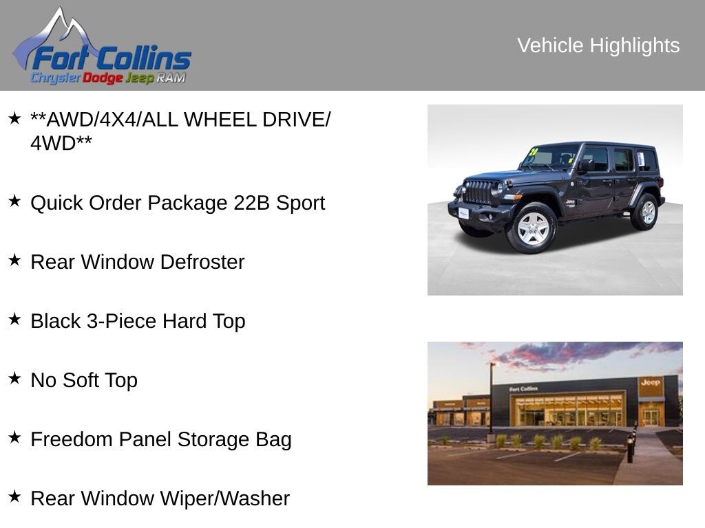 **AWD/4X4/ALL WHEEL DRIVE/4WD**, Black 3-Piece Hard Top, Freedom Panel Storage Bag, No Soft Top, Quick Order Package 22B Sport, Rear Window Defroster, Rear Window Wiper/Washer.