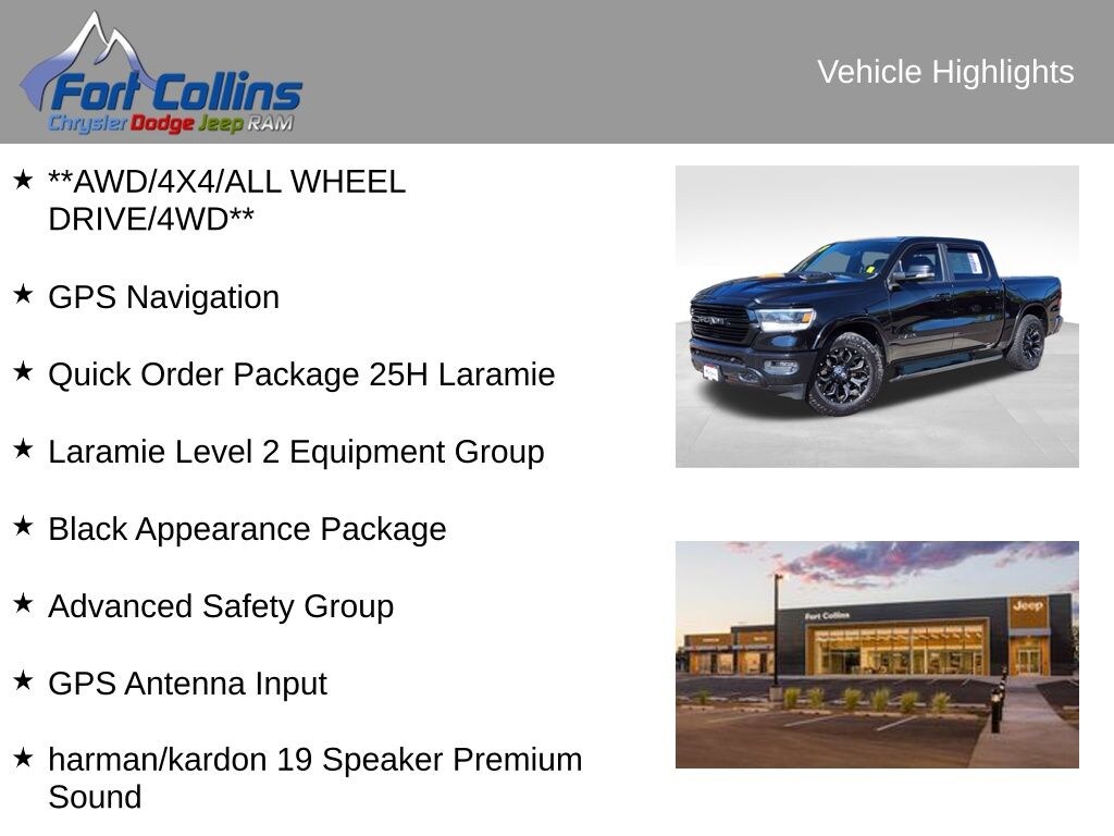 **AWD/4X4/ALL WHEEL DRIVE/4WD**, #1 Seat Foam Cushion, 1-Yr SiriusXM Guardian Trial, 3 Rear Seat Head Restraints, 4 Way Front Headrests, 5-Year SiriusXM Traffic Service, 5-Year SiriusXM Travel Link Service, 8.4" Touchscreen Display, Adaptive Cruise Control w/Stop & Go, Advanced Brake Assist, Advanced Safety Group, Apple CarPlay, Auto High Beam Headlamp Control, Black Appearance Package, Black Exterior Truck Badging, Black Headlamp Bezels, Black Interior Accents, Blind Spot & Cross Path Detection, Body Color Door Handles, Body Color Front Bumper, Body Color Rear Bumper w/Step Pads, Bucket Seats, Center Console Parts Module, Disassociated Touchscreen Display, Driver Seat Memory, Dual Exhaust w/Black Tips, Foam Bottle Insert (Door Trim Panel), For Details, Visit DriveUconnect.com, Front Seat Back Map Pockets, Full Length Upgraded Floor Console, Full Speed Forward Collision Warning Plus, GPS Antenna Input, GPS Navigation, Grille B/Color Outline 3 Texture 4, harman/kardon 19 Speaker Premium Sound, HD Radio, Heated Front Seats, Heated Second Row Seats, Heated Steering Wheel, Integrated Center Stack Radio, Lane Keep Assist, Laramie Level 2 Equipment Group, Leather Trimmed Bucket Seats, No Satellite Coverage w/HI/AK/PR/VI/GU, Parallel & Perp Park Assist w/Stop, ParkSense Front/Rear Park Assist w/Stop, Power 4-Way Driver Lumbar Adjust, Power 4-Way Passenger Lumbar Adjust, Power 8-Way Driver & Passenger Seats, Power Heated Fold-Away Mirrors, Quick Order Package 25H Laramie, Radio: Uconnect 4C Nav w/8.4" Display, Rain Sensitive Windshield Wipers, Rear 60/40 Folding Split Recline Seat, Rear Underseat Compartment Storage, Remote Tailgate Release, Single Disc Remote CD Player, SiriusXM Satellite Radio, SiriusXM Traffic Plus, SiriusXM Travel Link, Sport Performance Hood, Tailgate Ajar Warning Lamp, Ventilated Front Seats, Wheels: 22" x 9" Polished Painted, Wireless Charging Pad.