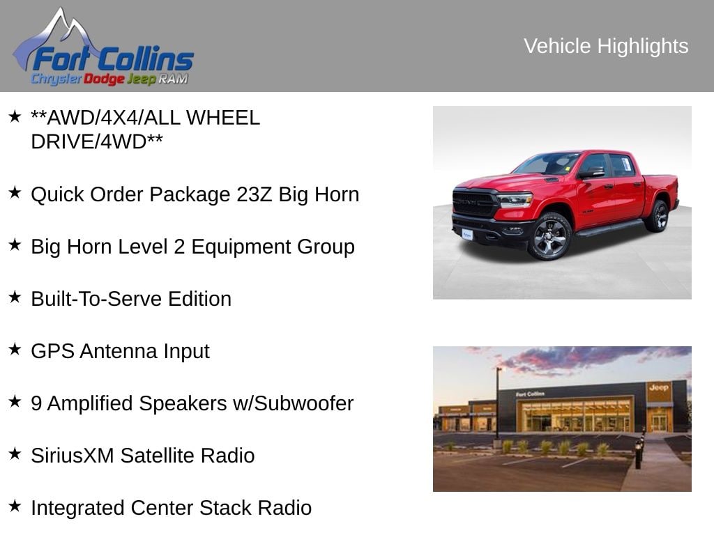 **AWD/4X4/ALL WHEEL DRIVE/4WD**, 115V Auxiliary Power Outlet, 115V Auxiliary Rear Power Outlet, 20" x 9" Aluminum Wheels, 2nd Row In Floor Storage Bins, 3 Rear Seat Head Restraints, 4 Way Front Headrests, 400W Inverter, 4G LTE Wi-Fi Hot Spot, 8.4" Touchscreen Display, 9 Amplified Speakers w/Subwoofer, Air Conditioning ATC w/Dual Zone Control, Apple CarPlay, Auto-Dimming Exterior Driver Mirror, Auto-Dimming Rear-View Mirror, Big Horn Badge, Big Horn Level 2 Equipment Group, Black Door Handles, Black Exterior Mirrors, Black Exterior Truck Badging, Black Front Bumper, Black Headlamp Bezels, Black Onyx Interior Accent, Black Premium Power Mirrors, Black Rear Bumper, Bluetooth Handsfree Phone & Audio, Body Color Fender Flares, Bucket Seats, Built-To-Serve Edition, Built-To-Serve Edition I/P Badge, Center Console Parts Module, Class IV Receiver Hitch, Cluster 7.0" TFT Color Display, Connectivity - US/Canada, Convex Wide-Angle Mirror Insert, Delete LED Lamp - Floor Console Bin, Dual Exhaust w/Black Tips, E-Locker Rear Axle, Exterior Mirrors Courtesy Lamps, Exterior Mirrors w/Heating Element, Exterior Mirrors w/Supplemental Signals, Falken Brand Tires, For Details, Visit DriveUconnect.com, Front Extra HD Shock Absorbers, Front LED Fog Lamps, Front Seat Back Map Pockets, Full Length Floor Console, Global Telematics Box Module (TBM), Glove Box Lamp, Google Android Auto, GPS Antenna Input, Grille Surround 1 Black Texture 1 Black, Heated Front Seats, Heated Steering Wheel, Hill Descent Control, Integrated Center Stack Radio, LED Reflector Headlamps, LED Taillamps, Manual Adjust 4-Way Front Passenger Seat, Media Hub w/2 Charge Only USBs, MOPAR Front & Rear Rubber Floor Mats, MOPAR Lockable Console Storage, ParkSense Front/Rear Park Assist w/Stop, Power 2-Way Driver Lumbar Adjust, Power 4-Way Driver Lumbar Adjust, Power 8-Way Driver Seat, Power Adjustable Pedals, Power-Folding Mirrors, Premium Cloth/Vinyl Bucket Seats, Quick Order Package 23Z Big Horn, Radio: Uconnect 5 W w/8.4" Display, Raised Ride Height, RAM Grille Badge - Black, Rear 60/40 Folding Seat, Rear Dome w/On/Off Switch Lamp, Rear Extra HD Shock Absorbers, Rear Power Sliding Window, Rear Window Defroster, Remote Start System, Security Alarm, SiriusXM Radio Service, SiriusXM Satellite Radio, Sun Visors w/Illuminated Vanity Mirrors, Tow Hooks, Universal Garage Door Opener, US Flag Decal, USB Host Flip.