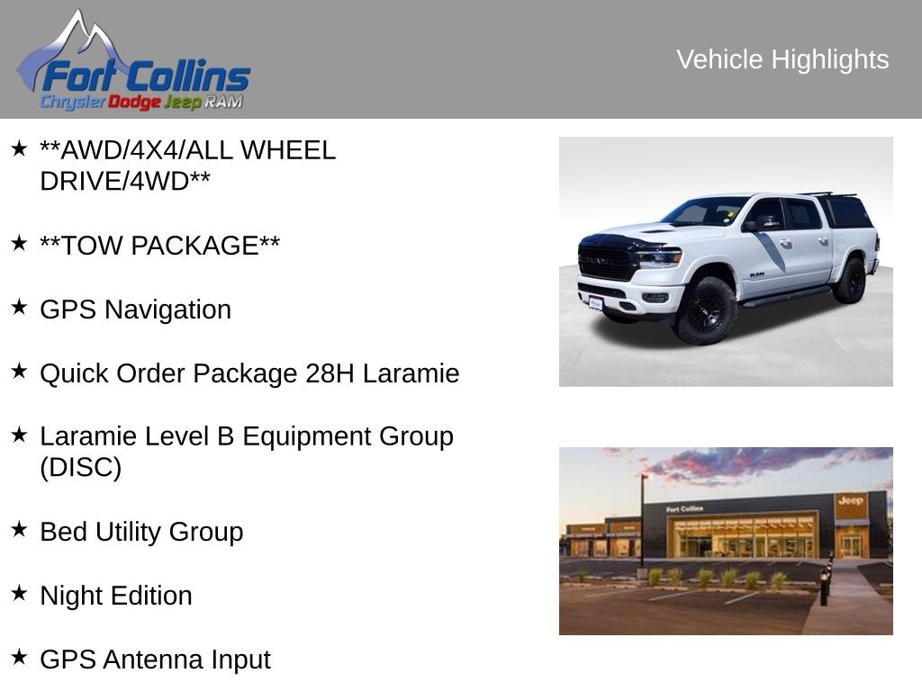 **AWD/4X4/ALL WHEEL DRIVE/4WD**, **TOW PACKAGE**, #1 Seat Foam Cushion, 3 Rear Seat Head Restraints, 4 Way Front Headrests, 4G LTE Wi-Fi Hot Spot, 8.4" Touchscreen Display, Accent Color Premium Power Mirrors, All R1 High Radios, All Radio Equipped Vehicles, Apple CarPlay, Auto High Beam Headlamp Control, Auto-Dimming Exterior Driver Mirror, Bed Utility Group, Black Exterior Truck Badging, Black Headlamp Bezels, Black Interior Accents, Black Painted Exterior Mirrors Caps, Body Color Door Handles, Body Color Front Bumper, Body Color Rear Bumper w/Step Pads, Bucket Seats, Connected Travel & Traffic Services, Connectivity - US/Canada, Convex Wide-Angle Mirror Insert, Delete LED Lamp - Floor Console Bin, Disassociated Touchscreen Display, Driver Seat Memory, Dual Exhaust w/Black Tips, Exterior Mirrors Courtesy Lamps, Exterior Mirrors w/Heating Element, Exterior Mirrors w/Memory, Exterior Mirrors w/Supplemental Signals, Foam Bottle Insert (Door Trim Panel), For Details, Visit DriveUconnect.com, For More Info, Call 800-643-2112, Front Seat Back Map Pockets, Full Length Upgraded Floor Console, Global Telematics Box Module (TBM), Google Android Auto, GPS Antenna Input, GPS Navigation, Grille Surround 3 Black Texture 2 Black, harman/kardon 19 Speaker Premium Sound, HD Radio, Heated Front Seats, Heated Second Row Seats, Heated Steering Wheel, Integrated Center Stack Radio, Integrated Voice Command w/Bluetooth, Laramie Level B Equipment Group (DISC), Leather Trimmed Bucket Seats, MOPAR 4 Adjustable Cargo Tie-Down Hooks, Mopar Black Tubular Side Steps, MOPAR Spray In Bedliner, Night Edition, ParkSense Front/Rear Park Assist w/Stop, Pick-Up Box Lighting, Power 2-Way Driver Lumbar Adjust, Power 2-Way Passenger Lumbar Adjust, Power 8-Way Driver & Passenger Seats, Power-Folding Mirrors, Quick Order Package 28H Laramie, Radio: Uconnect 5 Nav w/8.4" Display, Rain Sensitive Windshield Wipers, Rear 60/40 Folding Seat, Rear 60/40 Folding Split Recline Seat, Rear Underseat Compartment Storage, Remote Tailgate Release, SiriusXM Radio Service, SiriusXM w/360L, Sport Performance Hood, Twill Film Appliques, USB Host Flip, Ventilated Front Seats.