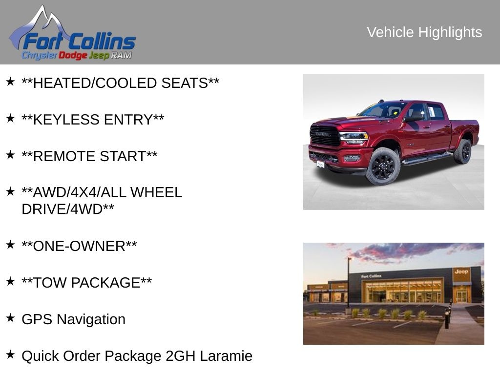 **HEATED/COOLED SEATS**, **KEYLESS ENTRY**, **REMOTE START**, **AWD/4X4/ALL WHEEL DRIVE/4WD**, **ONE-OWNER**, **TOW PACKAGE**, 17 Speaker harman kardon Premium Sound, 2nd Row In Floor Storage Bins, 4G LTE Wi-Fi Hot Spot, 8.4" Touchscreen Display, Alexa Built-In, All R1 High Radios, All Radio Equipped Vehicles, Apple CarPlay, Auto High Beam Headlamp Control, Black Exterior Mirrors, Black Exterior Truck Badging, Black Headlamp Bezels, Black Interior Accents, Black Ram Head Tailgate Badge, Black Tail Lamp Bezels, Black Wheel Center Hub, Body Color Door Handles, Body Color Grille Surround, Chrome Exterior Mirrors, Connected Travel & Traffic Services, Connectivity - US/Canada, Disassociated Touchscreen Display, Exterior Mirrors Courtesy Lamps, Exterior Mirrors w/Heating Element, Exterior Mirrors w/Memory, Exterior Mirrors w/Supplemental Signals, Foam Bottle Insert (Door Trim Panel), For Details, Visit DriveUconnect.com, For More Info, Call 800-643-2112, Global Telematics Box Module (TBM), Gloss Black Grille Billets/Accents, Google Android Auto, GPS Antenna Input, GPS Navigation, HD Radio, Heated Second Row Seats, Integrated Center Stack Radio, Integrated Voice Command w/Bluetooth, Laramie Level B Equipment Group (DISC), Mirror Running Lights, Mirror-Mounted Aux Reverse Lamps, Night Edition, Off-Road Information Pages, Painted Front Bumper, Painted Rear Bumper, Power Adjustable Convex Aux Mirrors, Power Adjustable Pedals w/Memory, Power Black Tow Mirrors w/Convex Spotter & Memory, Power Chrome Tow Mirrors w/Convex Spotter & Memory, Power Folding Mirrors, Quick Order Package 2GH Laramie, Radio: Uconnect 5 Nav w/8.4" Display, Radio/Driver Seat/Mirrors/Pedals Memory, Rain Sensitive Windshield Wipers, Remote Tailgate Release, Selectable Tire Fill Alert, SiriusXM Radio Service, SiriusXM w/360L, Trailer Tow Mirrors, Wheels: 20" x 8.0" Black Painted Aluminum.