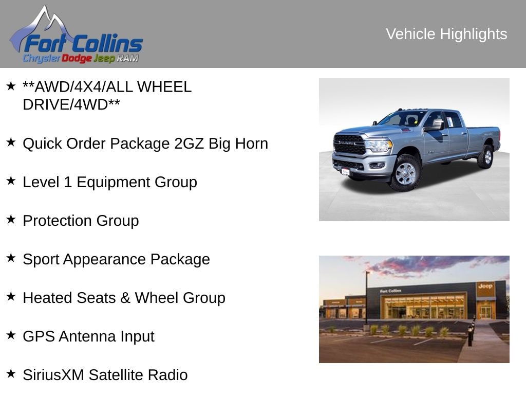**AWD/4X4/ALL WHEEL DRIVE/4WD**, 2 Way Rear Headrest Seat, 2nd Row In Floor Storage Bins, 4 Way Front Headrests, 40/20/40 Split Bench Seat, 4G LTE Wi-Fi Hot Spot, 8.4" Touchscreen Display, Apple CarPlay, Auto Power-Folding Mirrors, Big Horn IP Badge, Black Exterior Mirrors, Black Interior Accents, Bluetooth Handsfree Phone & Audio, Body Color Door Handles, Body Color Grille Surround, Connectivity - US/Canada, Dual Glove Boxes, Exterior Mirrors Courtesy Lamps, Exterior Mirrors w/Heating Element, Exterior Mirrors w/Supplemental Signals, Foam Bottle Insert (Door Trim Panel), Footwell Courtesy Lamp, For Details, Visit DriveUconnect.com, For More Info, Call 800-643-2112, Forward & Reverse Utility Lights, Front Armrest w/Cupholders, Front Center Seat Cushion Storage, Front Fog Lamps, Front Seat Back Map Pockets, Global Telematics Box Module (TBM), Glove Box Lamp, Google Android Auto, GPS Antenna Input, Heated Front Seats, Heated Seats & Wheel Group, Heated Steering Wheel, Integrated Center Stack Radio, Integrated Voice Command w/Bluetooth, Leather Wrapped Steering Wheel, Level 1 Equipment Group, Locking Lower Glove Box, Manual Adjust 4-Way Front Passenger Seat, Mirror Running Lights, Painted Front Bumper, Painted Rear Bumper, ParkSense Front/Rear Park Assist System, Power 2-Way Driver Lumbar Adjust, Power Adjust 8-Way Driver Seat, Power Adjust Mirrors, Power Adjustable Convex Aux Mirrors, Power Heated Fold Telescope Mirrors, Power Telescoping Mirrors, Premium Cloth 40/20/40 Bench Seat, Protection Group, Quick Order Package 2GZ Big Horn, Radio: Uconnect 5 W w/8.4" Display, Rear 60/40 Folding Seat, Rear Dome w/On/Off Switch Lamp, Selectable Tire Fill Alert, SiriusXM Radio Service, SiriusXM Satellite Radio, Sport Appearance Package, Sport Decal, Steering Wheel Mounted Audio Controls, Storage Tray, Tow Hooks.